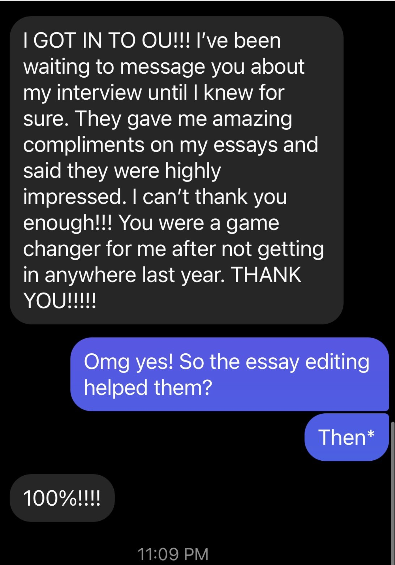 I also edit for transfer applicants, graduate school essays, as well as job resumes and cover letters!
